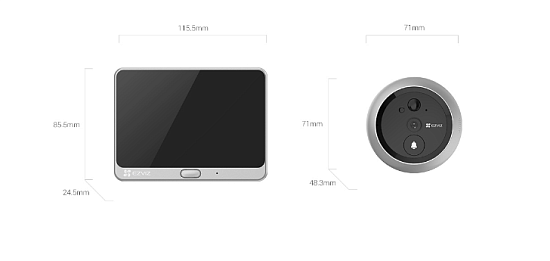 Ezviz CS-DP1C (SilverMetallic) - 720P, 1/3″ Progressive Scan CMOS 2.2 мм, угол обзора: 124°(Г), 70°(Д), ИК 3 м PIR датчик, угол наклона 100°, макс. 3 м, настраиваемая чувствительность Диаметр для установки камеры 18399 мм Толщина двери 35-105 мм Дисплей 4.3“ цветной экран H.264, 2.4 ГГц WiFi, частота кадров макс. 15 к/с, DC 5 В/2А От -10℃ до +45℃ (экран и станция) 115.5 x 85.5 x 24.5 мм, 343 г Облачное хранение EZVIZ, карта Micro SD (до 128 ГБ), NVR Перезаряжаемая литиевая батарея 4600 мА*ч Высокопрочный корпус из цинкового сплава Детекция лиц, детекция фигуры человека (PIR-датчик), обнаружение движения, уведомление о тревоге Двусторонная аудиосвязь Встроенный звонок