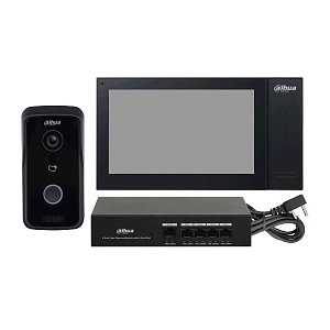 Dahua DHI-KTP02 - Комплект DH-VTO2111D-P-S2+DH-VTH2421FB-P Дверная IP-станция Villa. Камера с высоким разрешением; WDR. Рабочая температура от -30°C до 60°C. Степень защиты IP65. Поддержка автоматической ИК-подсветки и режима День/ночь. Открытие картой/через приложение/домофон. Поддержка двусторонней голосовой связи; поддержка звонков между дверными станциями и приложением. 10.000 карт. Тревога тампера. Поддержка стандартного источника питания PoE. Управление двумя замками.