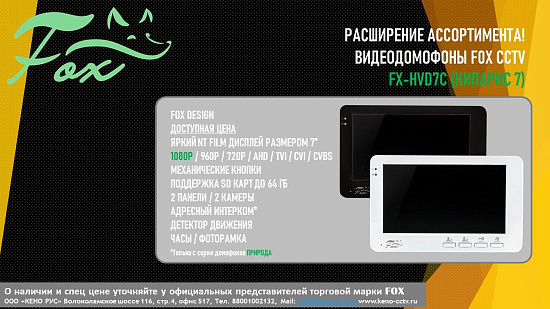 FX-HVD7С (КИПАРИС 7B): 1080P Видеодомофон:Дисплей: 7” NT Film; Разрешение: 1024×600; Яркость: 600 кд/см2; Одновременная поддержка стандартов видео 1080p/720p (TVI/CVI/AHD) и CVBS (960H); Адресный интерком до 6-и мониторов...