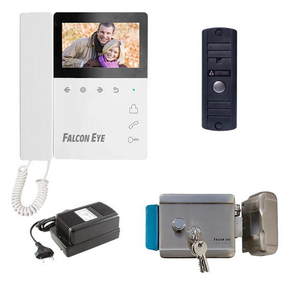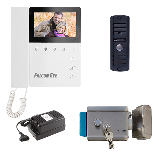 Falcon Eye Taurus - Комплект видеодомофона: Видеодомофон. Дисплей 4,3 дюйма, TFT, разрешение 480 × 272 сенсорные кнопки. Подключение: до 2-х вызывных панелей и до 2-х камер, OSD меню. Питание: AC 220 В, встроенный БП. Вызывная видеопанель. Накладная, 4-х проводная, с ИК подветкой до 0,6 м. Матрица 1/3", 1000 ТВл, угол обзора 75° (гор.) 55° (верт.). Питание: 12 В. Комплектация с угловым кронштейном.Накладной электромеханический замок в корпусе из нержавеющей стали, универсальный, цилиндр + 3 ключа, блокируемая кнопка выхода. Сила удержания 500 кг. Напряжение: 12 В, потребление: 45750 А. Источник стабилизированного питания, 12 В, 5 А. Регулировка выходного напряжения, электронная защита от КЗ. Крепления кабеля: зажимные колодки. Шнур питания 220 В входит в комплект поставки устройства.
