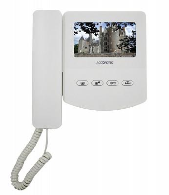 AccordTec AT-VD433C WH - Цветной 4-x проводный, 4.3’’ TFT LCD (320х240) видеодомофон. Регулировка громкости вызова. Подключение двух вызывных панелей. Накладной тип крепления. Габаритные размеры: 175 х 155 х 25 мм. Цвет корпуса черный и белый. Питание AC220V. Совместим с вызывными панелями CVBS.