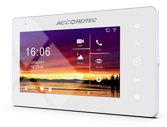 AccordTec AT-VD 760C/SD WH - Видеодомофон 7" Сенсорный экран, 1080P/720P/CVBS Подключение 2-х вызывных панелей и 2-х видеокамер.Календарь, будильник. Загрузка собственных мелодий MP3 в качестве сигнала вызова домофона....