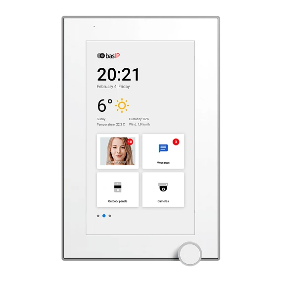 BAS-IP AZ-07L WHITE - 7-дюймовый (IPS) IP-видеомонитор для помещений с возможностью горизонтального и вертикального монтажа, возможностью управления лифтом, отображением сообщений от управляющей компании, PoE, подключением 32 камер, памятью для фотографий/видео и голосовой почтой. ОПЕРАЦИОННАЯ система – Android. Размеры: 195 x 127 x 27 мм. Корпус: пластик, стекло.
