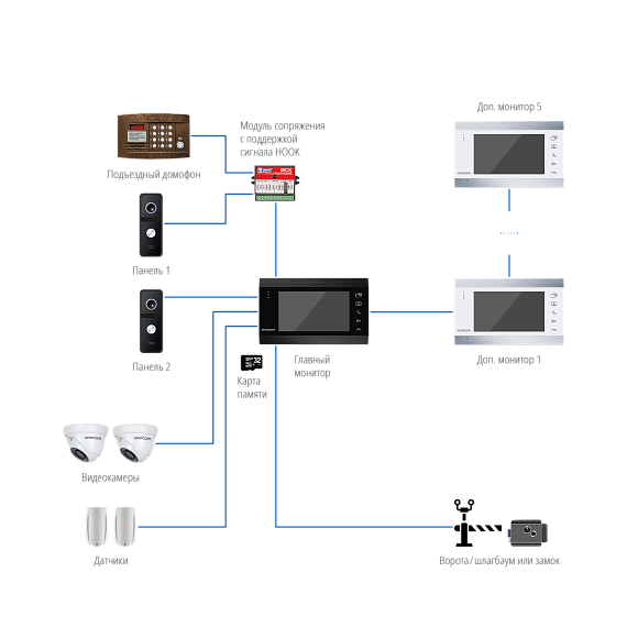 К монитору можно подключить до 5 дополнительных мониторов или использовать его в качестве дополнительного к другим совместимым мониторам Novicam. При подключении нескольких мониторов становится доступной функция адресного интеркома. Это позволяет общаться в пределах одной системы, а также переадресовывать вызов с внешней панели на другой монитор.