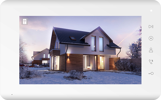 Монитор цветного видеодомофона адаптированный для работы с цифровыми подъездными домофонами, 7 дюймов с сенсорными кнопками и поддержкой форматов CVBS (PAL / NTSC). Тонкий корпус 18мм со встроенным блоком питания.