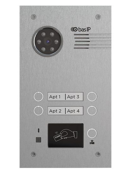 BAS-IP BA-04MD SILVER - Вызывная панель на 4 абонента. Считыватель карт и брелоков по стандарту Mifare® Plus и Mifare® Classic. Цифровая IP камера: 2 Мп. Угол обзора 100°. Возможность поворота камеры ± 15°. Врезной монтаж....