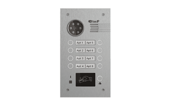BAS-IP BA-08BD SILVER - Вызывная панель на 8 абонентов. Поддержка технологии "UKEY": считывание карт, брелоков и мобильных идентификаторов по стандартам EM-Marin, Mifare® Plus и Mifare® Classic, Bluetooth, NFC. Цифровая IP камера: 2 Мп. Возможность поворота камеры ± 15°. Врезной монтаж. Накладной монтаж - опционально (кронштейн BR-AA). Степень защиты: IP65. Температурный режим: -40 до +65°C. Отдельная кнопка вызова консьержа. Питание: PoE 802.3af и +12В. Поддержка SIP P2P, Выход Wiegand 26, 32, 34, 37, 40, 42, 56, 58, 64 бит, RS485. Размер: 375×155×50 мм. Гарантия - 5 лет. Открытый API, поддержка ПО Link.