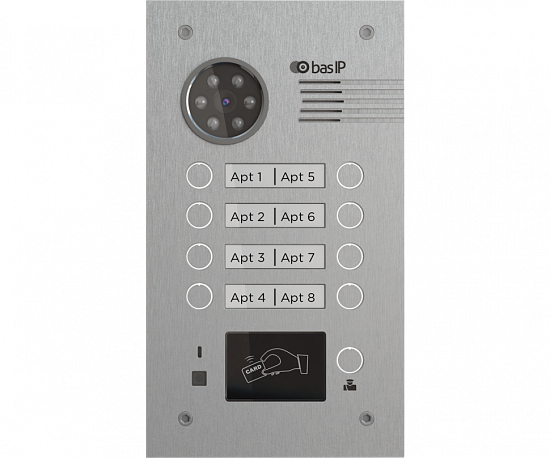 BAS-IP BA-08MD SILVER - Вызывная панель на 8 абонентов. Считыватель карт и брелоков по стандарту Mifare® Plus и Mifare® Classic. Цифровая IP камера: 2 Мп. Угол обзора 100°. Возможность поворота камеры ± 15°. Врезной монтаж. Накладной монтаж - опционально (кронштейн BR-BA). Степень защиты: IP65. Температурный режим: -40 до +65°C. Отдельная кнопка вызова консьержа. Питание: PoE 802.3af и +12В. Поддержка SIP P2P, Выход Wiegand 26, 32, 34, 37, 40, 42, 56, 58, 64 бит, RS485. Размер: 155х270х50 мм. Гарантия - 5 лет. Открытый API, поддержка ПО Link.