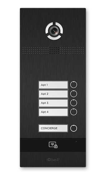 BAS-IP BI-04FB BLACK - Вызывная панель на 4 абонента. Поддержка технологии "UKEY": считывание карт, брелоков и мобильных идентификаторов по стандартам EM-Marin, Mifare® Plus и Mifare® Classic, Bluetooth, NFC. 3D идентификация по...