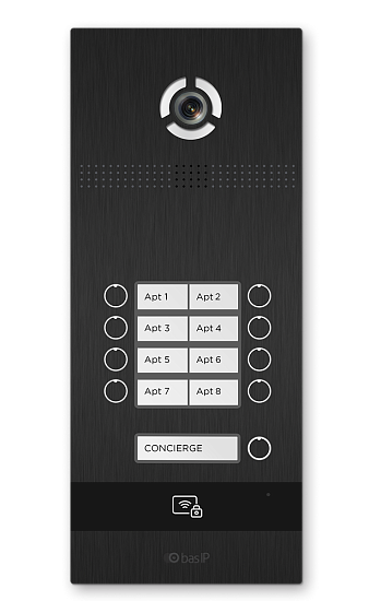 BAS-IP BI-08FB BLACK - Вызывная панель на 8 абонентов. Поддержка технологии "UKEY": считывание карт, брелоков и мобильных идентификаторов по стандартам EM-Marin, Mifare® Plus и Mifare® Classic, Bluetooth, NFC. 3D идентификация по...