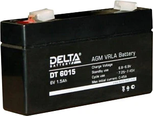 Описание: Delta DT 6015 - Свинцово-кислотный, герметичный аккумулятор, 6В/1,5Ач, ножевые клеммы 4,8 мм (F1), 97х24х52мм, 0,3 кг