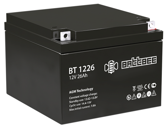Battbee BT 1226 - Стационарный аккумулятор Battbee BT 1226 (напряжение 12 В, ёмкость 26 Ач) разработан специально для охранно-пожарных систем, он может использоваться в буферном и циклическом режимах. Срок службы батареи при соблюдении правил эксплуатации составляет 3 года.