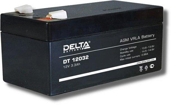 Герметизированный VRLA cвинцово-кислотный аккумулятор Delta DT 12032 напряжением 12В и емкостью 3.3 Ач изготовлен по технологии AGM (с микропористым заполнителем, пропитанным электролитом). Корпус изготовлен из негорючего ABS пластика. Срок службы аккумулятора рассчитан на 3-5 лет работы. Аккумулятор предназначен для работы в режиме постоянного подзаряда (т.н. буферный режим), обладает низким внутренним сопротивлением и саморазрядом. Дополнительно к аккумулятору у нас можно подобрать для него зарядное устройство.