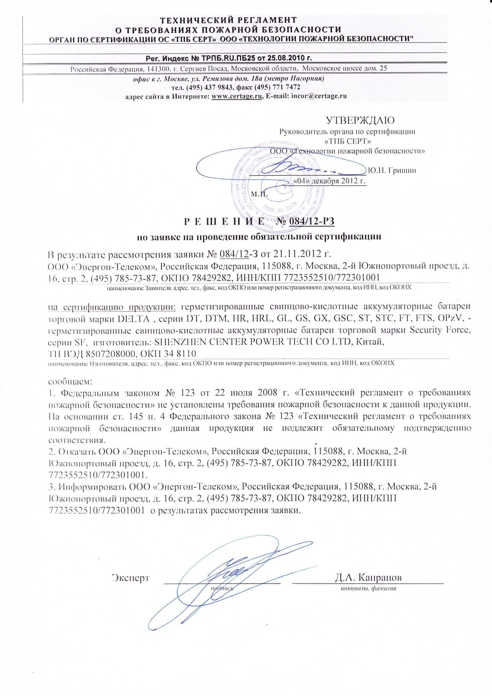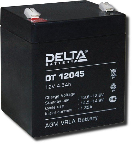 Герметизированный VRLA cвинцово-кислотный аккумулятор Delta DT 12045 напряжением 12В и емкостью 4.5Ач изготовлен по технологии AGM (с микропористым заполнителем, пропитанным электролитом). Корпус изготовлен из негорючего ABS пластика. Срок службы аккумулятора рассчитан на 3-5 лет работы. Аккумулятор предназначен для работы в режиме постоянного подзаряда (т.н. буферный режим), обладает низким внутренним сопротивлением и саморазрядом. Дополнительно к аккумулятору у нас можно подобрать для него зарядное устройство.