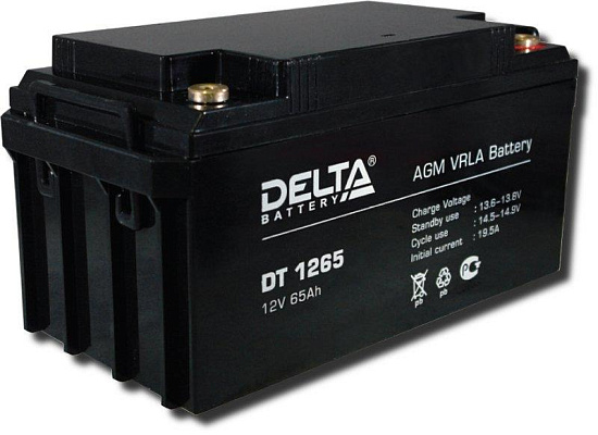 Герметизированный VRLA cвинцово-кислотный аккумулятор Delta DT 1265 напряжением 12В и емкостью 65Ач изготовлен по технологии AGM (с микропористым заполнителем, пропитанным электролитом). Корпус изготовлен из негорючего ABS пластика. Срок службы аккумулятора рассчитан на 7-10 лет работы. Аккумулятор предназначен для работы в режиме постоянного подзаряда (т.н. буферный режим), обладает низким внутренним сопротивлением и саморазрядом. Дополнительно к аккумулятору у нас можно подобрать зарядное устройство для него, батарейный шкаф или стеллаж.