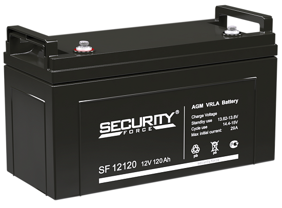Security Force SF 12120 - свинцово-кислотная аккумуляторная батарея высокой емкости (120 А∙ч). Предназначена для обеспечения питанием 12 В постоянного тока. Электролит абсорбированный (технология AGM)