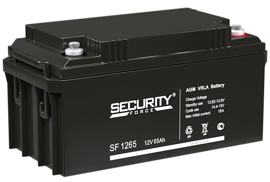 Security Force SF 1265 — необслуживаемая свинцово-кислотная батарея напряжением 12В и номинальной емкостью 65Ач. Модель оптимизирована для резервного и автономного энергообеспечения систем, для функционирования которых требуются малые токи. Установленная производителем на SF 1265 цена рассчитана с учетом технических параметров блока и прогнозированных сроков службы: при соблюдении условий эксплуатации ресурса АКБ хватает на 8 лет бесперебойной работы.