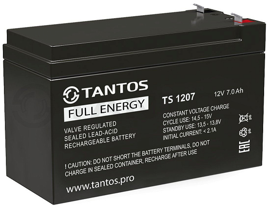 Tantos TS 1207 - Свинцово-кислотный аккумулятор TS 12В, 7А∙ч. для резервного электропитания приборов, систем ОПС Технология AGM. Рабочее напряжение: 12 В, Емкость: 7 А∙ч, Клеммы: Нож F1 (Faston). Вес: 1,97 кг, Габаритный размер 151×65×100 мм. Срок службы: 200-250 циклов "заряд-разряд" при 100% разряде или до 3 лет в буферном режиме.