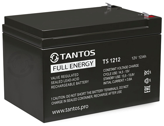 Tantos TS 1212 - Свинцово-кислотный аккумулятор TS 12В, 12А∙ч. для резервного электропитания приборов, систем ОПС Технология AGM. Рабочее напряжение: 12 В, Емкость: 12 А∙ч, Клеммы: Нож F1 (Faston). Вес: 3,45 кг, Габаритный размер 151×98×101 мм. Срок службы: 200-250 циклов "заряд-разряд" при 100% разряде или до 3 лет в буферном режиме.