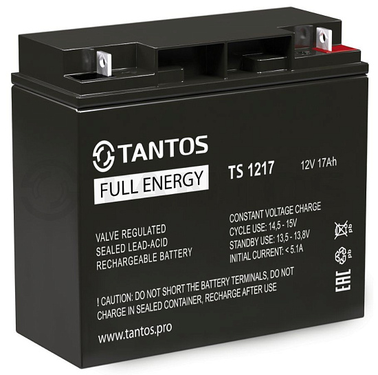 Tantos TS 1217 - Свинцово-кислотный аккумулятор TS 12В, 17А∙ч. для резервного электропитания приборов, систем ОПС Технология AGM. Рабочее напряжение: 12 В, Емкость: 17 А∙ч, Клеммы: Нож F1 (Faston). Вес: 5,1 кг, Габаритный размер 181×77×167 мм. Срок службы: 200-250 циклов "заряд-разряд" при 100% разряде или до 3 лет в буферном режиме.