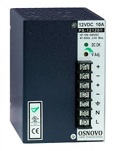 Описание: PS-12120/I Промышленный блок питания. DC12V, 10A (120W). Диапазон входных напряжений: AC100-240V. КПД: 80%. Регулировка выходного напряжения в диапазоне 11-13V. Защита от короткого замыкания, перенапряжения и перегрузки. Конвекционное охлаждение. Монтаж на DIN-рейку или стену. Размеры (ШxВxГ): 75x110x121мм. Рабочая температура: -40...+50°C.
