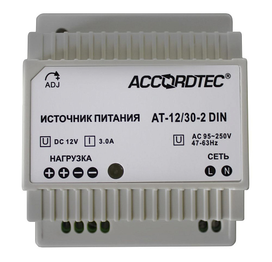 AccordTec AT-12/30-3 DIN - Источник стабилизированного питания с креплением на DIN рейку; входные характеристики 100-240VAC 50/60Hz; Рабочая температура : -10°C ~ +50°C, выходные характеристики: 12VDC (регулируется 12-18), Iвых = 3A (ном.).Выходная мощность 54W Габаритные размеры: 96 х 78 х 56 мм