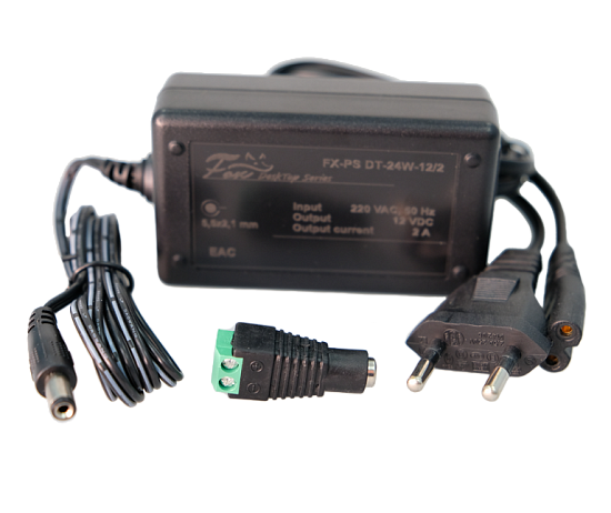 FX-PS DT-24W-12/2 12, 2А. Габариты 85х50х32,5 мм. Цвет корпуса черный. Разъем: mini jack 3.5 mm, длина шнура питания 1 м. Сетевой шнур интегрированный, длина 1 м. Защита от КЗ, перегрузки, от повышенного напряжения. Диапазон рабочих температур -20°C-50°C