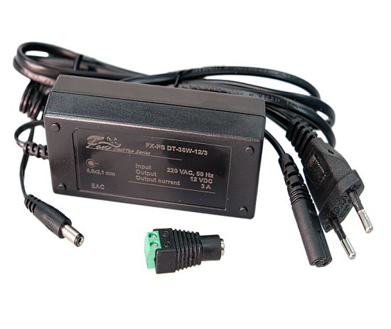 FX-PS DT-36W-12/3 12В, 3А. Габариты 90х36х91 мм. Цвет корпуса черный. Разъем: mini jack 3.5 mm, длина шнура питания 1 м Сетевой шнур интегрированный, длина 1 м. Защита от КЗ, перегрузки, от повышенного напряжения. Диапазон рабочих температур -20°C-50°C