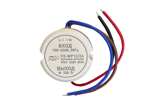 FX-WP12/2A: Уличный влагозащитный блок питания IP67. Подходит для подрозетника Ø55 . Входное напряжение 90-250V, Выходное 12V, Номинальный ток 1.8A, Максимальный 2А, Мощность до 24Вт, Рабочая температура -30 +40С, Габаритные размеры Ø55*23, Вес 0,29кг. Комплектация: Блок питания, паспорт, WAGO разъем, коннектор 12В.