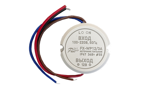 FX-WP12/3A: Уличный влагозащитный блок питания IP67. Подходит для подрозетника Ø55 . Входное напряжение 90-250V, Выходное 12V, Номинальный ток 2.8A, Максимальный 3А, Мощность до 36Вт, Рабочая температура -30 +40С, Габаритные размеры Ø55*23, Вес 0,32кг. Комплектация: Блок питания, паспорт, WAGO разъем, коннектор 12В.