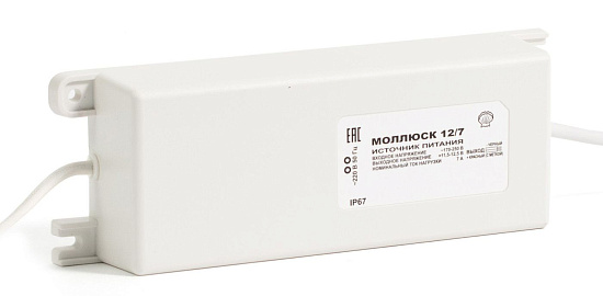 Бастион Моллюск-12/7 - 12В, 7А, габариты 205х70х40 мм, защита выхода от КЗ и перегрузки, прочность изоляции 3 кВ, проушины для крепления, корпус IP67