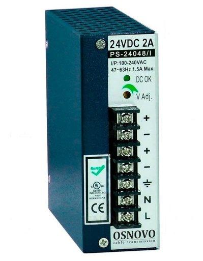 PS-24048/I Промышленный блок питания Osnovo PS-24048/I предназначен для выпрямления сетевого тока и подачи постоянного стабилизированного напряжения 24 В DC на оборудование систем видеонаблюдения и СКУД.Характеристики:Входное напряжение — 100 ~ 240 В AC.Регулирование выходного напряжения — 22 В ~ 26 В.Ток подключаемого оборудования — 2 А.Мощность нагрузки — до 48 Вт.Автоматическое возобновление работы после отключения при скачках сетевого напряжения, короткого замыкания. Предусмотрено конвекционное охлаждение блока питания, защита от короткого замыкания, перегрузки и перенапряжения. О состоянии устройства сигнализирует LED-индикатор. Клеммы: выхода питания (основные и дополнительные), подключения нейтрального и фазового проводов, заземления. Подключение — под винт, монтаж — на DIN-рейку, на стену. Диапазон рабочих температур — -40 °C… +50 °C. Габариты — 40?110?121 мм.