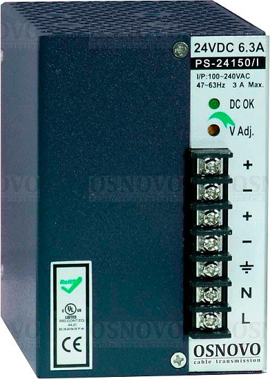 PS-24150/I Промышленный блок питания. DC24V, 6,3A (150W). Диапазон входных напряжений: AC100-240V. КПД: 82%. Регулировка выходного напряжения в диапазоне 22-26V. Защита от короткого замыкания, перенапряжения и...