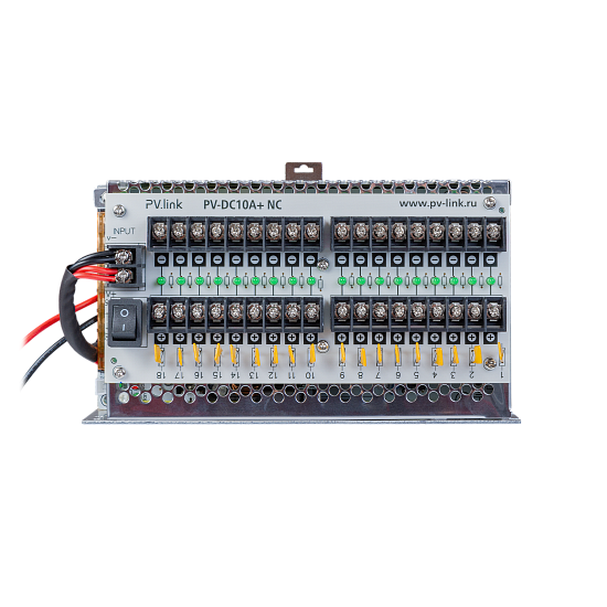 PV-DC10A+ NC PV-Link v.2090 - блок питания стабилизированный, DC 12 В, 10 А, 18 выходов, с креплением на DIN рейку, выход на 2 АКБ (7.1 А·ч), внутреннее исполнение, встроенная защита