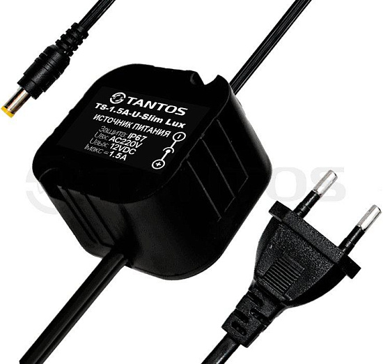 Tantos TS-1,5A-Slim Lux - Источник вторичного электропитания 12В, 1.5А. Выход: +12В/1.5А, разъём питания; вход: ~220В, сетевой шнур с вилкой в розетку. Длина кабеля: 40 см (от БП до разъема) + 40 см (от БП до вилки)....