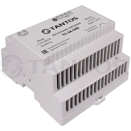 Tantos TS-5A-DIN - Источник вторичного питания на DIN-рейку 12В, 5А. встроенная защита от короткого замыкания нагрузки, перегрузки по напряжению и току, регулировка выходного напряжения (11.2 - 14.2 В). 93×87×55мм.