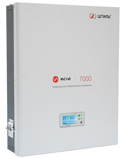 Штиль ИнСтаб IS7000 (220-230В) - Стабилизатор переменного напряжения инверторный (с двойным преобразованием) однофазный, чистая синусоида; P-нагр.7 кВА/5 кВт, U-вх.90…310 В, U-вых.220…230 В (с шагом 1В), I-вых.32 А; IP20, t-раб.+5…+40°C, 366х353х104мм