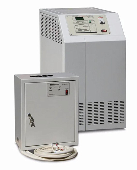 Штиль R 27000 - Стабилизатор переменного напряжения серии «Стандарт»; однофазный; P-нагр.27 кВА, U-вх.180…245 В, U-вых.211…229 В; защита от перегрузки и КЗ; IP30, t-раб.+1…+40°C, 1х (330х570х670мм) + 1х (400х210х510мм), 115 кг. В комплекте блок коммутации и стабилизатор.