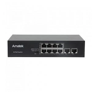 Описание: Amatek AN-S10P8A - Коммутатор на 10 портов (8 PoE+ портов + 2 порта Uplink 100Mбит/с): 8 портов 10/100Mbps RJ45, Auto-MDIX, PoE/PoE+ до 15.4/30 Вт каждый;+ 2 порта 10/100Mbps RJ45 (Uplink).Поддержка IEEE 802.3af/at/bt Power over Ethernet. Суммарная мощность PoE до 120Вт, (функция watchdog).Индикация: Link/Activity, Скорость, PoE, 220В. Таблица MAC адресов 4К, матрица 2,4 Гбит/с.Режим CCTV позволяет передавать данные на расстояние до 250 метров на скорости до 10 Мбит/с. Поддержка деления на 8 VLAN. Защита портов от перенапряжения до 6000В (ESD). Температура -20…+ 55°С. Встроенный блок питания AC ~100-240В. Размеры 202x104x44,5 мм.