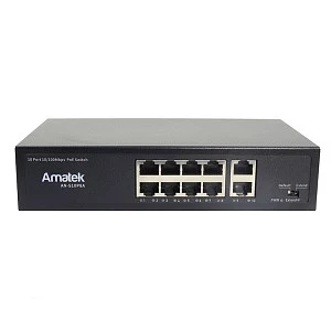 Описание: Amatek AN-S10P - Коммутатор на 10 портов (8 PoE+ портов, 2 порта Uplink): 8 портов 10/100Mbps с PoE/PoE+ до 15.4/30 Вт каждый, RJ45, Auto-MDIX; 2 порта 10/100Mbps RJ45 (Uplink), Auto-MDIX. Поддержка IEEE 802.3af/at Power over Ethernet. Суммарная мощность PoE/PoE+ до 120Вт. Поддержка определение зависания PoE устройств c перезагрузкой по PoE (WatchDog). Средняя наработка на отказ (MTBF) 100000 часов. Индикация: Link/Activity, Скорость, PoE, VLAN, 220В. Таблица MAC адресов 1К, матрица 2 Гбит/с. Режим CCTV позволяет передавать данные на расстояние до 230 метров на скорости до 10 Мбит/с. Поддержка деления на 8 VLAN. Защита портов от перенапряжения, короткого замыкания и переполюсовки. Температура -20…+ 45°С. Питание AC 110-240В. Размеры 200x120x45 мм.