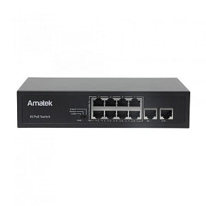 Описание: Amatek AN-S10P8GA - Коммутатор на 10 портов (8 PoE+ портов + 2 порта Uplink): 8 портов 10/100Mbps RJ45, Auto-MDIX, PoE/PoE+ до 15.4/30 Вт каждый + 2 порта 10/100/1000Mbps RJ45 (Uplink). Поддержка IEEE 802.3af/at Power over Ethernet. Увеличенная дальность передачи питания по PoE до 250м. Суммарная мощность PoE/PoE+ до 120Вт. Индикация: Link/Activity, Скорость, PoE, 220В. Таблица MAC адресов 4К, матрица 7,2 Гбит/с. Режим CCTV позволяет передавать данные на расстояние до 250 метров на скорости до 10 Мбит/с. Поддержка деления на 8 VLAN. Функция PoE Watchdog - контроль и перезапуск устройств с PoE по питанию. Защита портов от перенапряжения, короткого замыкания и переполюсовки. Температура -20…+ 55°С. Встроенный блок питания AC110-265В. Размеры 202x104x45 мм.