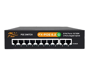 Описание: FX-POE8.2G 10 портов 10/100/1000 Мбит/с (IEEE802.3u 100BaseTX) из них 8 c поддержкой PoE (IEEE802.3at) до 30Вт на порт (HI POE) + два порта UPLINK 10/100/1000 Мбит/с, Суммарная мощность потребителей 120 Вт, таблица МАС адресов - 2К, пропускная способность 5.6Гбит\с, Буфер обмена 2Мб Режим 1: 1-8 порт 10/100 Base-T (PoE) до 100 метров Режим 2: 1-8 порт 10 Base-T (PoE) до 250 метров Габаритные размеры 199 x 136 x 45 мм, 220В встроенный блок питания.