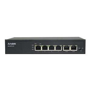 Описание: Amatek AN-S6P4M - Коммутатор на 6 портов (4 PoE+ порта + 2 порта Uplink): 4 порта 10/100Mbps RJ45, Auto-MDIX, PoE/PoE+ до 15.4/30 Вт каждый; + 2 порта 10/100Mbps RJ45 (Uplink). Поддержка PoE (IEEE 802.3af/at). Суммарная мощность PoE/PoE+ до 60Вт. Индикация: Link/Activity, Скорость, PoE, 220В. Таблица MAC адресов 1К, матрица 1,2 Гбит/с. Режим CCTV позволяет передавать данные на расстояние до 250 метров на скорости до 10 Мбит/с. Поддержка деления на 4 VLAN. Режим приоритетной передачи данных. Контроль и перезапуск устройств с PoE по питанию. Защита портов от перенапряжения, короткого замыкания и переполюсовки. Температура 0…+ 45°С. Питание DC52В±10%, 1,25А (в комплекте). Размеры 125x77x27 мм.