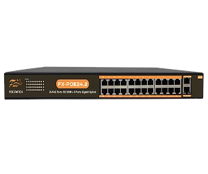 Описание: FX-POE24.2 26 портов 10/100/1000 Мбит/с (IEEE802.3u 100BaseTX) из них 24 c поддержкой PoE (IEEE802.3at) 10/100 до 30Вт на порт (HI POE) + два порта UPLINK 10/100/1000 Мбит/с; Суммарная мощность потребителей 360 Вт; таблица МАС адресов - 4К, пропускная способность 16Гбит\с, Буфер 4Мб. Режим 1: 1-24 порт 10/100 Base-T (PoE) до 100 метров Режим 2: 1-16 порт 10/100 Base-T (PoE) до 100 метров 17-24 порт 10 Base-T (PoE) до 250 метров Габаритные размеры 440 x 230 x 45 мм, 220В встроенный блок питания.