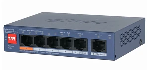 Описание: Dahua DH-PFS3005-4ET-36 - 4-портовый неуправляемый коммутатор с РоЕ Порты: 4 RJ45 10/100Мбит/с (PoE/PoE+/Hi-PoE), 1 RJ45 10/100Мбит/с (uplink); мощность PoE: суммарно до 36Вт; передача до 250м; питание: 48~57В(DC)