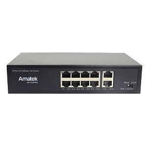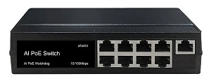 Описание: Amatek AN-S10P8A - Коммутатор на 10 портов (8 PoE+ портов + 2 порта Uplink 100Mбит/с): 8 портов 10/100Mbps RJ45, Auto-MDIX, PoE/PoE+ до 15.4/30 Вт каждый;+ 2 порта 10/100Mbps RJ45 (Uplink).Поддержка IEEE 802.3af/at/bt Power over Ethernet. Суммарная мощность PoE до 120Вт, (функция watchdog).Индикация: Link/Activity, Скорость, PoE, 220В. Таблица MAC адресов 4К, матрица 2,4 Гбит/с.Режим CCTV позволяет передавать данные на расстояние до 250 метров на скорости до 10 Мбит/с. Поддержка деления на 8 VLAN. Защита портов от перенапряжения до 6000В (ESD). Температура -20…+ 55°С. Встроенный блок питания AC ~100-240В. Размеры 202x104x44,5 мм.