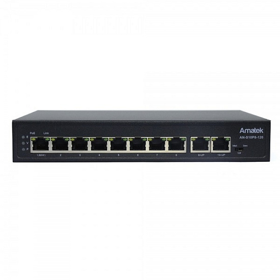 Amatek AN-S10P8-120 c HiPoE - Коммутатор на 10 портов (1 HiPoE + 7 PoE+ портов + 2 порта Uplink 100Mбит/с): 1 порт 10/100Mbps RJ45, Auto-MDIX, PoE/PoE+/HiPoE до 15.4/30/60 Вт каждый; 7 портов 10/100Mbps RJ45, Auto-MDIX, PoE/PoE+ до 15.4/30 Вт каждый; + 2 порта 10/100Mbps RJ45 (Uplink). Поддержка IEEE 802.3af/at/bt Power over Ethernet. Суммарная мощность PoE до 120Вт. Индикация: Link/Activity, Скорость, PoE, 220В. Таблица MAC адресов 1К, матрица 2 Гбит/с. Режим CCTV позволяет передавать данные на расстояние до 250 метров на скорости до 10 Мбит/с. Поддержка деления на 8 VLAN. Защита портов от перенапряжения, короткого замыкания и переполюсовки. Температура -10…+ 55°С. Потребляемая мощность 3Вт (без учёта PoE). Встроенный блок питания AC ~220В. Размеры 210x150x35 мм.