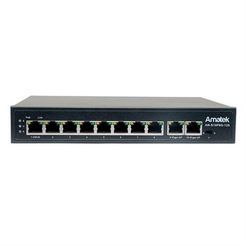 Amatek AN-S10P8G-120 c HiPoE - Коммутатор на 10 портов (8 PoE+ портов + 2 порта Uplink 1000Mбит/с): 1 порт 10/100Mbps RJ45, Auto-MDIX, PoE/PoE+/HiPoE до 15.4/30/60 Вт; 7 портов 10/100Mbps RJ45, Auto-MDIX, PoE/PoE+ до 15.4/30 Вт каждый; + 2 порта 10/100/1000Mbps RJ45 (Uplink). Поддержка IEEE 802.3af/at/bt Power over Ethernet. Суммарная мощность PoE до 120Вт. Индикация: Link/Activity, Скорость, PoE, 220В. Таблица MAC адресов 4К, матрица 5,6 Гбит/с. Режим CCTV позволяет передавать данные на расстояние до 250 метров на скорости до 10 Мбит/с. Поддержка деления на 8 VLAN. Защита портов от перенапряжения, короткого замыкания и переполюсовки. Температура -10…+ 55°С. Потребляемая мощность 3Вт (без учёта PoE). Встроенный блок питания AC ~220В. Размеры 210x150x35 мм.