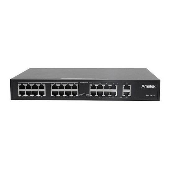 Amatek AN-S26P24A - Коммутатор на 26 портов (24 PoE+ порта + 2 порта Uplink): 24 порта 10/100M RJ-45 PoE/PoE+ (до 15.4/30 Вт каждый) + 2 порта 10/100/1000M RJ-45 (Uplink). Поддержка PoE (IEEE 802.3af/at). Увеличенная дальность передачи...