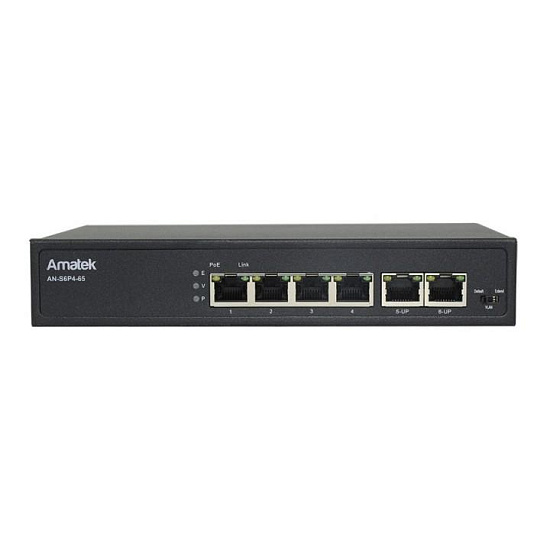 Amatek AN-S6P - Коммутатор на 6 портов (4 PoE+ порта, 2 порта FE Uplink): 4 порта 10/100Mbps с PoE/PoE+ до 15.4/30 Вт каждый, RJ45, Auto-MDIX; 2 порта 10/100Mbps RJ45 (Uplink), Auto-MDIX. Поддержка IEEE 802.3af/at Power over Ethernet. Суммарная мощность PoE до 65Вт....